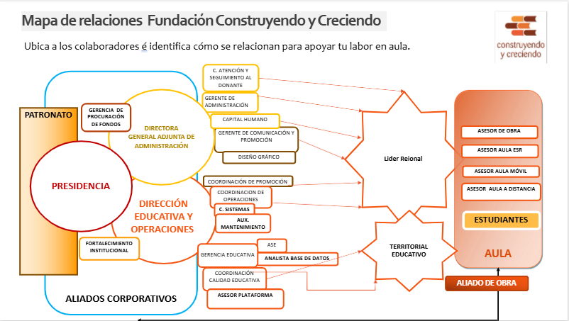 El Corazón del Impacto (El Aula): Todo el esfuerzo converge en la derecha del mapa. Aquí, los Asesores y los Aliados de Obra trabajan de la mano para transformar la vida de nuestro centro de atención: los Estudiantes.